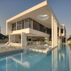 Pushing architectural boundaries, the hallmark of this residence is its open plan design for indoor/outdoor living. At the centre, a spacious living hub brings together the kitchen, dining and lounge. Frameless glass walls unfold to an expansive outdoor entertaining space. A 25m infinity-edge pool and sunken lounge sit alongside a fully equipped outdoor kitchen and dining area — all open and connected to nature in this expansive waterfront location.